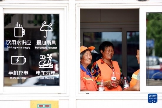 最近,山東省臨沂市郯城縣綜合執(zhí)法局在城區(qū)和建筑工地附近設(shè)立了多個(gè)“愛心驛站”。20多家愛心企業(yè)為驛站捐贈(zèng)了雨傘、桌椅、西瓜、飲水機(jī)、充電器等物資?!皭坌捏A站”免費(fèi)為環(huán)衛(wèi)工人、外賣小哥、建筑工人等戶外勞動(dòng)者、新業(yè)態(tài)就業(yè)群體提供休息、納涼等服務(wù)。