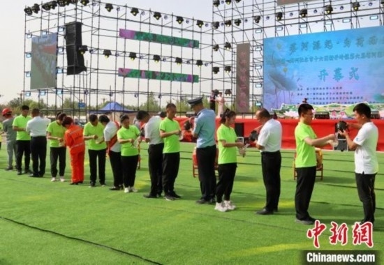 開幕式上,11位優(yōu)秀行業(yè)代表傳遞塔河源頭之水,傳承兵團精神。毛琴攝