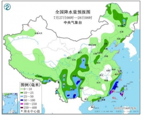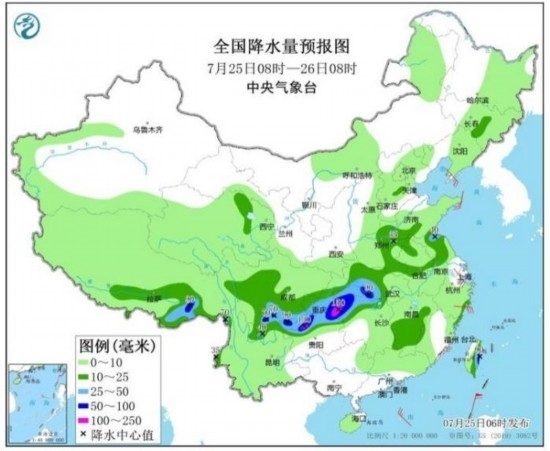 圖3 全國降水量預報圖(7月25日08時-26日08時)