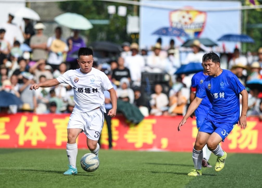 7月15日,六佰塘村足球隊球員楊宗維(左)在與月寨村足球隊的比賽中帶球進攻。新華社記者 楊文斌 攝