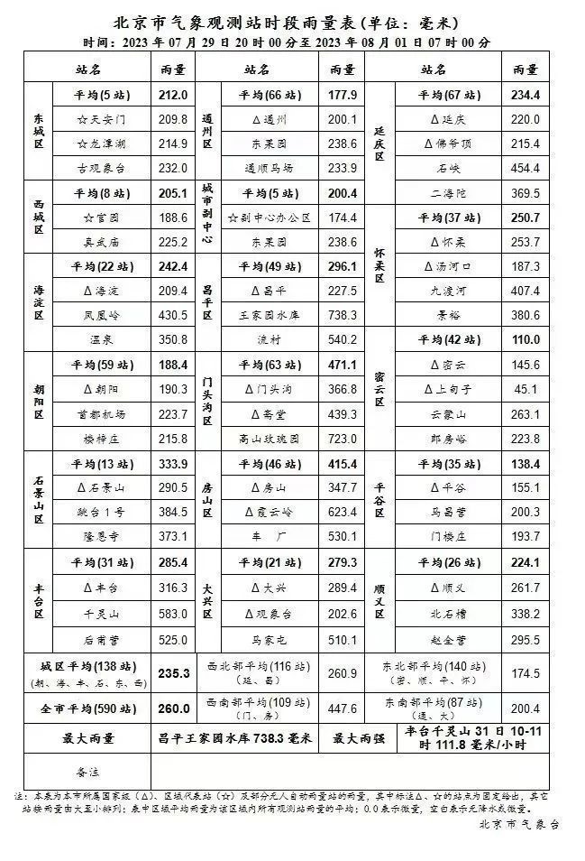 據(jù)北京市氣象臺(tái)消息,29日20時(shí)至8月1日7時(shí),北京地區(qū)全市平均降雨量260.0毫米,城區(qū)平均235.3毫米,房山區(qū)平均415.4毫米,門(mén)頭溝區(qū)平均471.1毫米;最大小時(shí)雨強(qiáng)出現(xiàn)在豐臺(tái)千靈山,31日10-11時(shí)111.8毫米/小時(shí)。