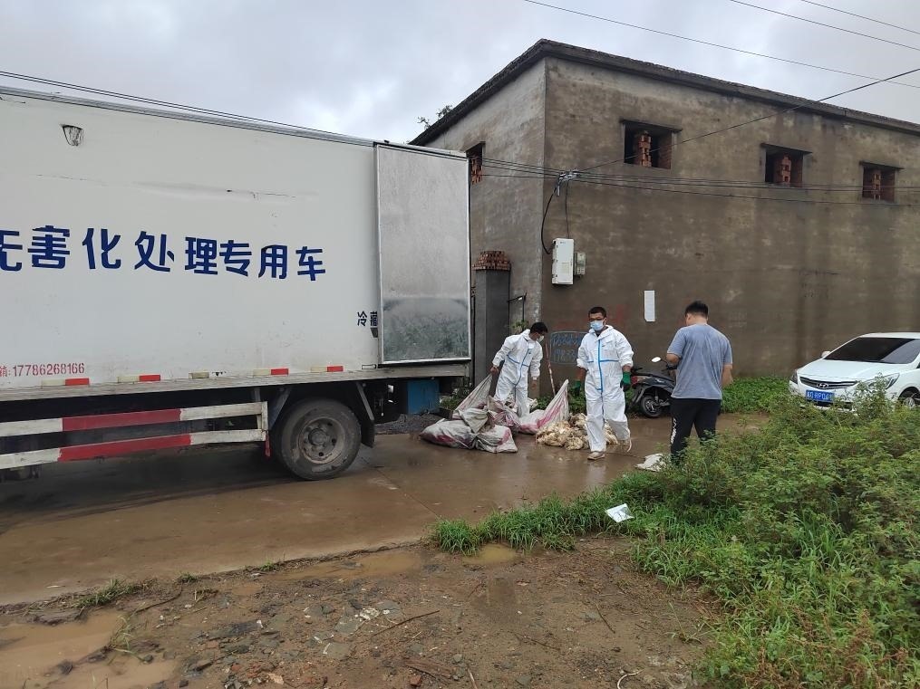 在邯鄲市雞澤縣雙塔鎮(zhèn)中申底村一家蛋雞養(yǎng)殖場(chǎng)內(nèi),縣農(nóng)業(yè)農(nóng)村局動(dòng)物衛(wèi)生監(jiān)督所負(fù)責(zé)人高仁鵬帶領(lǐng)消毒技術(shù)指導(dǎo)組成員對(duì)養(yǎng)殖場(chǎng)內(nèi)淹死的410只蛋雞進(jìn)行集中收集,通過專業(yè)車輛運(yùn)往病死畜禽無害化處理廠進(jìn)行專業(yè)處理。