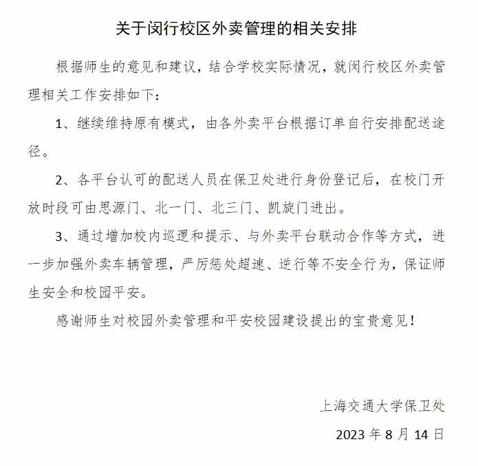 通知顯示,即日(8月3日)起,原外賣平臺(tái)向保衛(wèi)處備案過的外賣配送員,可從東川路600號(hào)(“凱旋門”)入校完成配送,未經(jīng)平臺(tái)報(bào)備的外賣配送員禁止進(jìn)校配送,只需將交大外賣訂單送至就近中轉(zhuǎn)站即可。9月1日起,所有外賣配送員禁止入校,校園外賣專送團(tuán)隊(duì)承接所有校園外賣訂單。