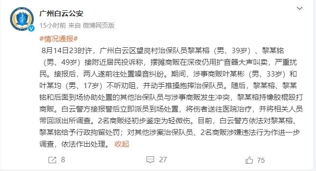 【8點(diǎn)見】廣州警方通報治保隊(duì)員持棍打商販:2名隊(duì)員被行拘