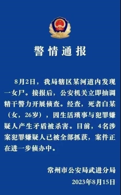 ·警方通報江蘇常州一女子被分尸:4名嫌疑人為兩男兩女,均已落網(wǎng)。