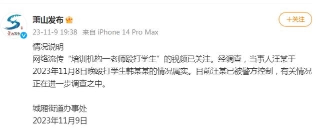 ·杭州蕭山通報“培訓(xùn)機構(gòu)一老師毆打?qū)W生”:屬實,打人者已被警方控制。
