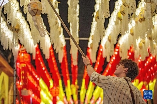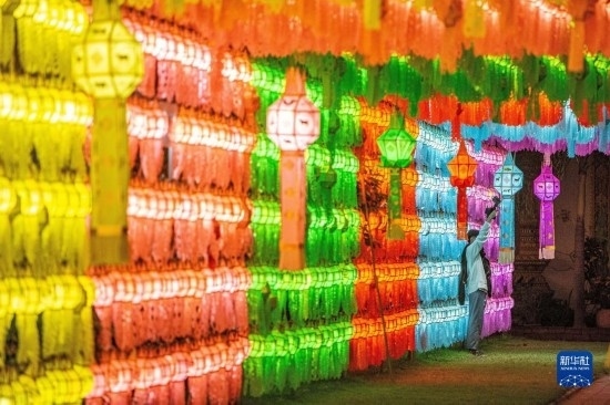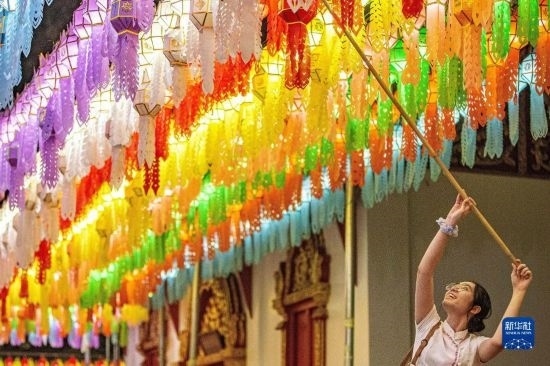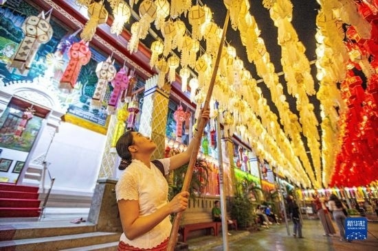 11月23日,游客在泰國(guó)南奔府哈利奔猜寺懸掛燈籠。