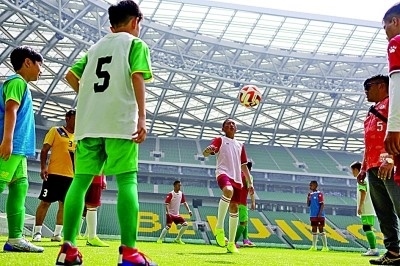 來自青海玉樹的40名藏族青少年參加“青海玉樹藏族青少年北京行”公益活動,與國安少年足球隊交流。新華社發(fā)
