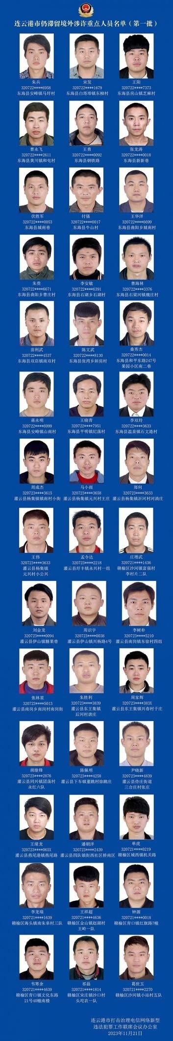 ·江蘇連云港警方發(fā)布首批42名非法滯留境外涉詐重點(diǎn)人員名單,要求滯留人員主動于2023年12月20日前通過正規(guī)渠道入境回國,并在入境前向戶籍地派出所報備。對于拒不回國投案自首的,司法機(jī)關(guān)將依法嚴(yán)懲。