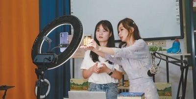 沈珺(右)在指導(dǎo)學(xué)生進行直播營銷。汪玉瑩攝
