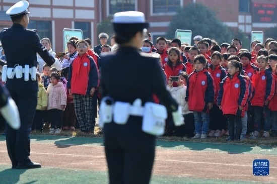 12月1日,在長沙市望城區(qū)新河學校,學生觀看交警手勢演示(無人機照片)。