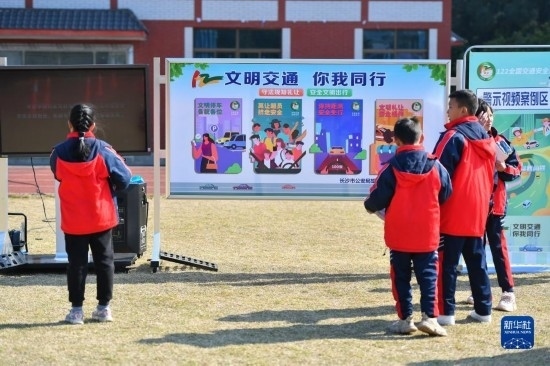 12月1日,在長沙市望城區(qū)新河學校,學生觀看交警手勢演示。
