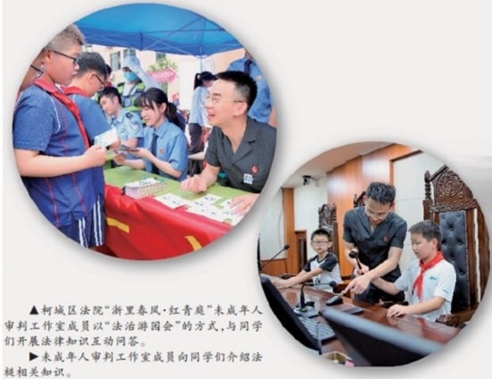 “‘紅青庭’品牌Logo中,‘紅’字既突出黨建統(tǒng)領(lǐng)又寓意紅領(lǐng)巾,是百折不撓的精神象征;‘青’字代表著青少年,是肩負(fù)未來的青春力量;‘庭’字則是指少年法庭和家庭?!焙l(wèi)民介紹,柯城區(qū)法院依托“浙里春風(fēng)·紅青庭”品牌,成立青少年法治教育實踐基地和未成年人審判工作室,積極開展內(nèi)外聯(lián)動,在持續(xù)加強(qiáng)涉未成年人刑事、民事、行政審判融合的基礎(chǔ)上,不斷深化與公安、檢察、教育、團(tuán)委、婦聯(lián)等部門的協(xié)調(diào)配合,構(gòu)筑全方位、多鏈條的綜合司法保護(hù)機(jī)制。