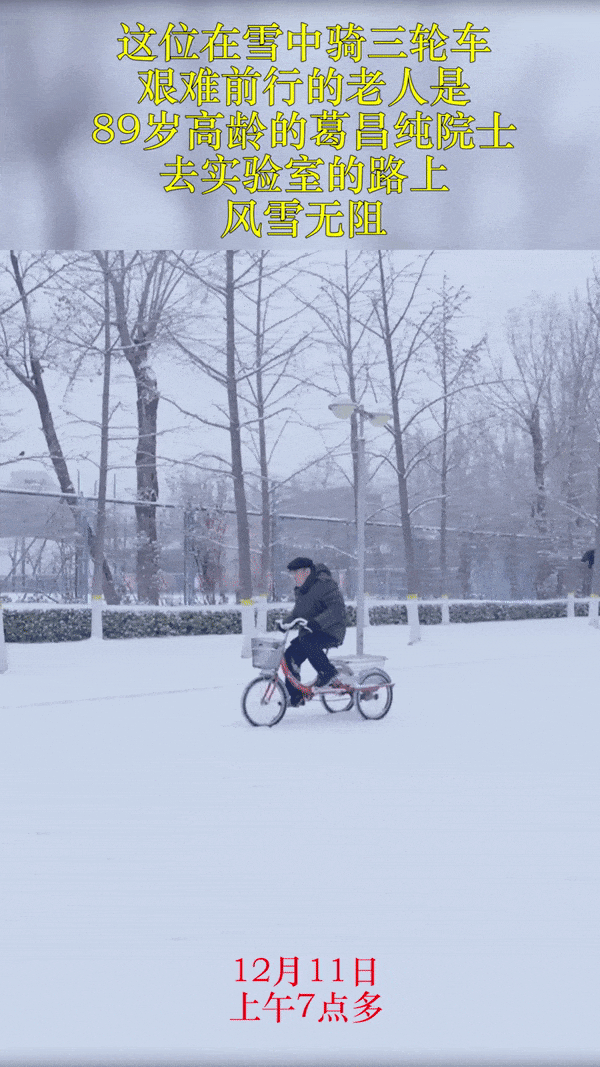 近日,早上7點多,北京降雪后,在北京科技大學(xué)的校園內(nèi),拍到感人一幕。茫茫白雪中,一位老人吃力地蹬著三輪車緩緩地前進(jìn),風(fēng)雪無阻。老人是89歲的葛昌純院士,這天早晨,他正騎車前往實驗室,而騎著三輪車去實驗室,是葛老幾十年如一日的堅持。葛昌純院士是著名核材料、粉末冶金以及先進(jìn)陶瓷專家,是我國“核工業(yè)功勛”人物,為“兩彈一星”事業(yè)作出了重要貢獻(xiàn)。