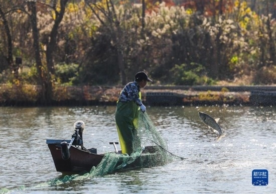 12月14日,在諸暨市白塔湖國營漁場的水域內(nèi),漁民在放網(wǎng)捕魚。