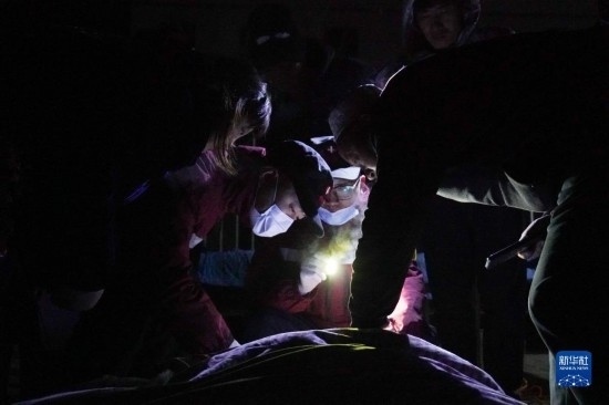 12月19日,在甘肅省臨夏回族自治州積石山保安族東鄉(xiāng)族撒拉族自治縣大河家鎮(zhèn)大河村,醫(yī)務(wù)工作人員搭建救援平臺。