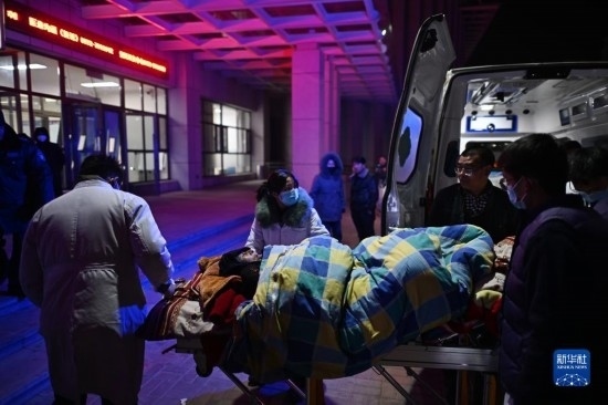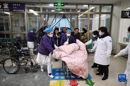12月19日,在甘肅省臨夏回族自治州積石山保安族東鄉(xiāng)族撒拉族自治縣中西醫(yī)結(jié)合醫(yī)院門口,醫(yī)務(wù)工作者查看傷者情況。