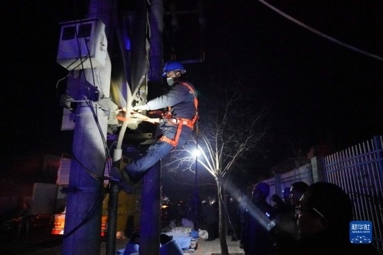 12月19日,在甘肅省臨夏回族自治州積石山保安族東鄉(xiāng)族撒拉族自治縣中西醫(yī)結(jié)合醫(yī)院門口,電力部門工作人員搶修電力設(shè)施。