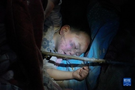12月19日,在甘肅省臨夏回族自治州積石山保安族東鄉(xiāng)族撒拉族自治縣積石山縣中西醫(yī)結(jié)合醫(yī)院門口,一名受傷兒童得到安置和初步診療后熟睡。