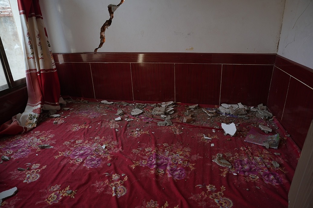 12月23日當天,馬國忠和叔叔伯伯兩家都在家門前搭起剛領的帳篷。叔叔馬進明家受損嚴重,兩堵磚墻的銜接處完全開裂,像條拉鏈被猛地拽下;天花板掉了大半,木頭架構的屋頂赫然露在豁口里。所幸,他和家人平時在縣城租房住。
