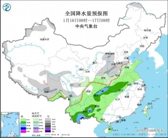 1月16日08時(shí)至17日08時(shí),新疆北疆北部、內(nèi)蒙古中部偏南地區(qū)、西藏中東部、青海南部、川西高原、陜西、山西、河北南部、河南西部和北部、山東西部、湖北西北部、云南西北部等地的部分地區(qū)有小到中雪或雨夾雪,其中云南西北部等地局地有大到暴雪;西南地區(qū)東部、黃淮南部、江漢、江淮、江南西部、云南、廣西西部等地有小到中雨,其中重慶中東部、湖北西南部、貴州西南部、云南南部等地的部分地區(qū)有大雨,局地暴雨(50~60毫米)。浙江北部和東部、西藏等地的部分地區(qū)有4~6級(jí)風(fēng);臺(tái)灣海峽有6~7級(jí)、陣風(fēng)8級(jí)的東北風(fēng)(見圖2)。