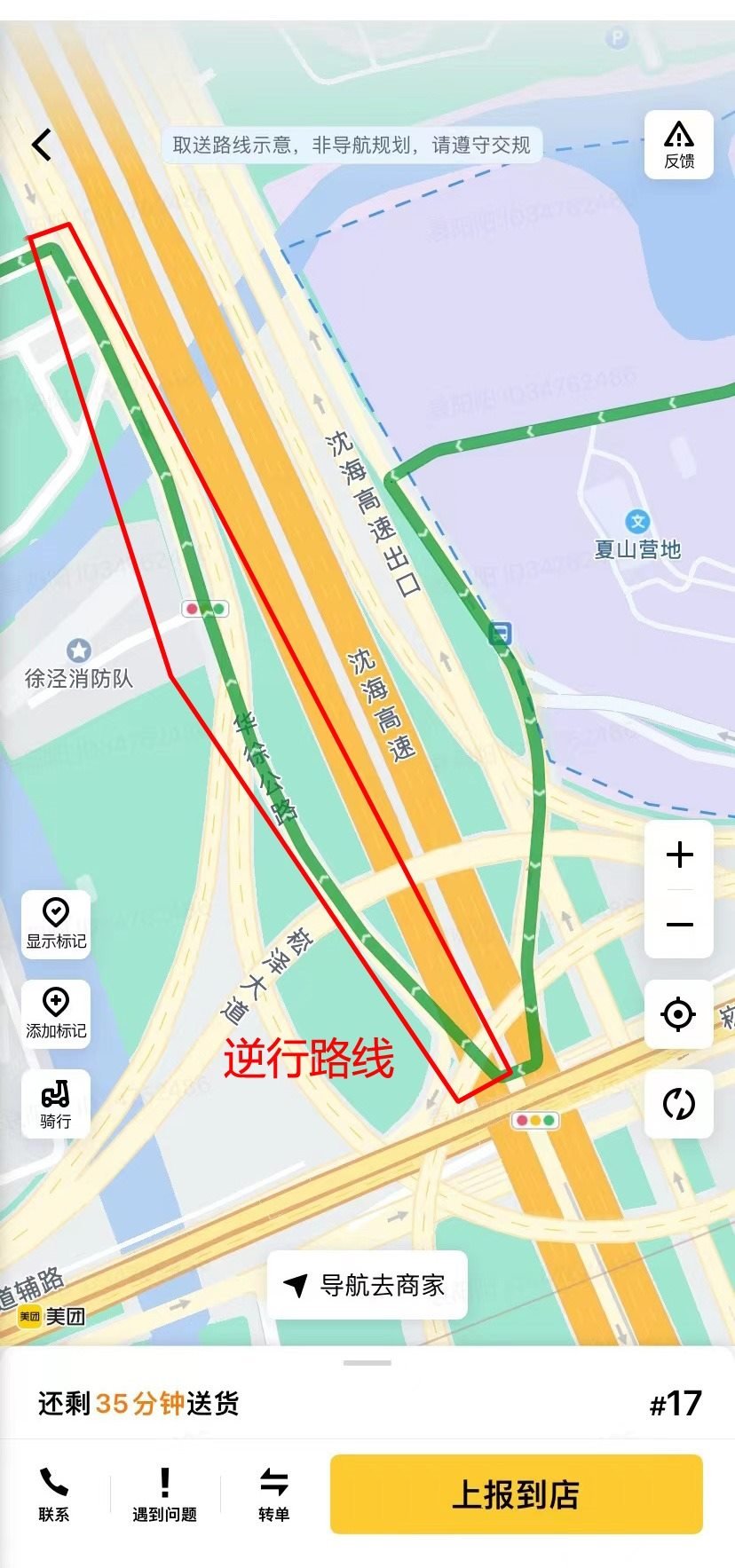 “途經(jīng)滬青平公路時,平臺也愛規(guī)劃逆行路線。”陳陽陽提供的第3條逆行路線正屬于這一情況。這是從京華路187弄送往南山雨果小區(qū)的一單,平臺規(guī)劃的路線中,指示騎手從明珠路右拐進入滬青平公路向西騎行至葉聯(lián)路再向南。可是,滬青平公路在葉聯(lián)路路口處沒有過街橫道線,此時,平臺索性規(guī)劃騎手沿著滬青平公路南側(cè)逆向騎行。1月8日,記者實地走了一遍這段路線:若騎手沿著滬青平公路北側(cè)騎行,需一直向西騎到徐盈路才能過街,再沿著滬青平公路南側(cè)向東抵達葉聯(lián)路。手機顯示,繞行路線比美團平臺規(guī)劃路線遠了1.2公里。