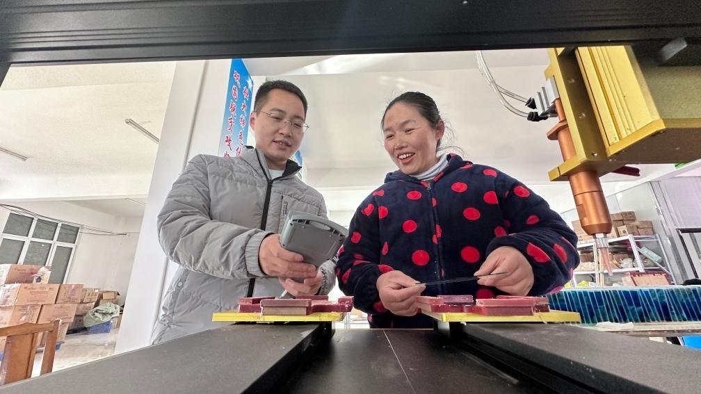 楊威指導(dǎo)村民使用機(jī)械設(shè)備制作流沙畫。新華社記者張鐘仁 攝