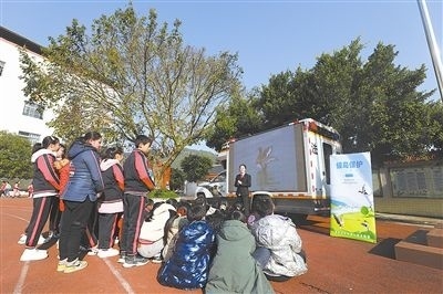 干警利用“車載便民法庭”播放宣傳片,教孩子們認(rèn)識棲息在當(dāng)?shù)氐恼滟F候鳥。