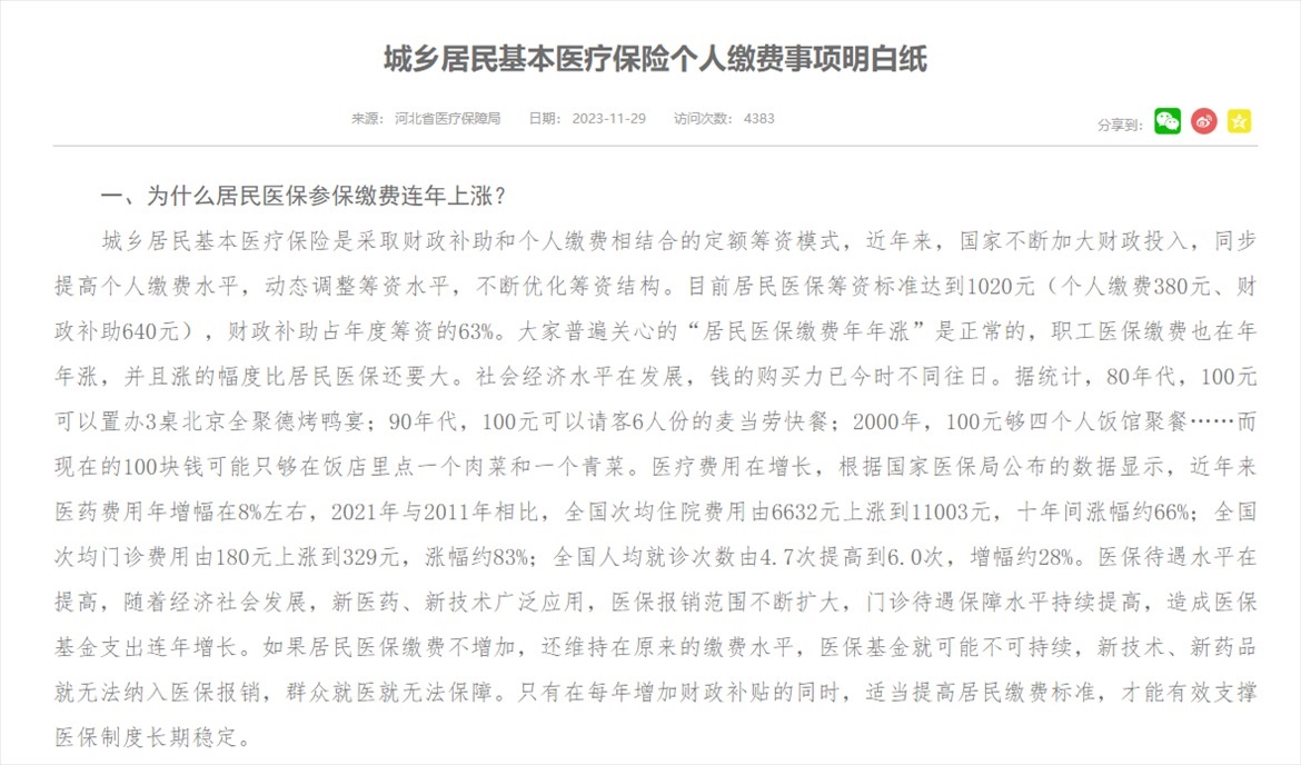 記者注意到,河北省醫(yī)保局去年11月份曾發(fā)布《城鄉(xiāng)居民基本醫(yī)療保險(xiǎn)個(gè)人繳費(fèi)事項(xiàng)明白紙》,其中就“為什么居民醫(yī)保參保繳費(fèi)連年上漲?”問題回應(yīng)稱:“大家普遍關(guān)心的‘居民醫(yī)保繳費(fèi)年年漲’是正常的,職工醫(yī)保繳費(fèi)也在年年漲,并且漲的幅度比居民醫(yī)保還要大。社會(huì)經(jīng)濟(jì)水平在發(fā)展,錢的購買力已今時(shí)不同往日,醫(yī)療費(fèi)用在增長,醫(yī)保待遇水平在提高。如果居民醫(yī)保繳費(fèi)不增加,還維持在原來的繳費(fèi)水平,醫(yī)?;鹁涂赡懿豢沙掷m(xù),新技術(shù)、新藥品就無法納入醫(yī)保報(bào)銷,群眾就醫(yī)就無法保障?!?/p>