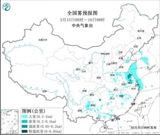 15日白天至夜間,渤海灣、黃海西部和東北部海域、東海西北部海域、山東東部沿岸海域、江蘇沿岸海域、長江口附近海域、杭州灣附近海域?qū)⒂心芤姸炔蛔?公里的大霧。此外,15日早晨至上午,江蘇大部、河南東部、貴州西部、湖南東部、江西北部等地的部分地區(qū)有大霧,局地有能見度不足200米的強(qiáng)濃霧。中央氣象臺3月15日06時發(fā)布大霧黃色預(yù)警。
