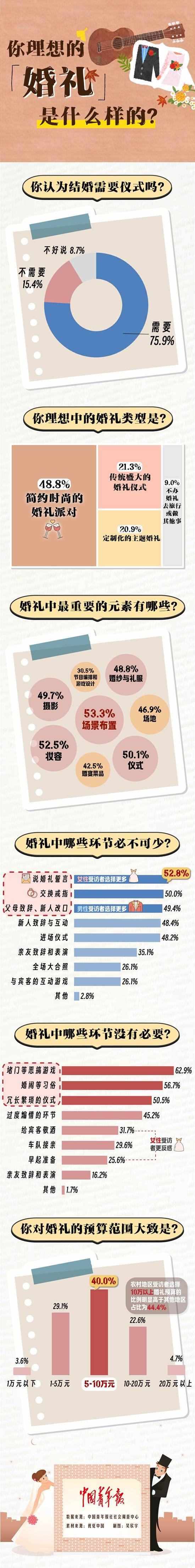 數(shù)據(jù)顯示,在婚禮中,受訪青年覺得最沒有必要的內(nèi)容依次是:堵門等惡搞游戲(62.9%)、婚鬧等習俗(56.7%)、冗長繁瑣的儀式(50.5%)。其他還有:過度煽情的環(huán)節(jié)(45.2%),給賓客敬酒(31.7%),車隊接親(29.6%),早起準備(25.6%)等。