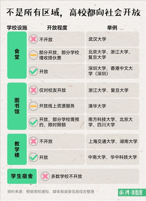 最令在校學(xué)生頭疼的要與游客爭搶學(xué)校資源的問題,例如食堂、圖書館和教學(xué)樓等,各個(gè)學(xué)校在決定開放校園的同時(shí)也給出了相關(guān)規(guī)定。