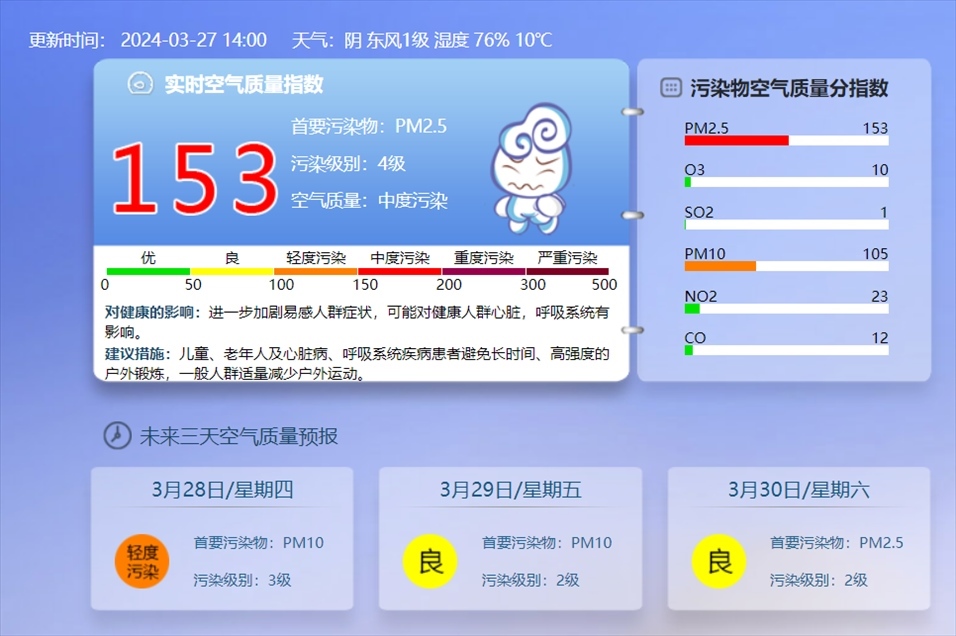 央視網(wǎng)消息:據(jù)@北京環(huán)境監(jiān)測 消息,3月27日14時(shí),北京實(shí)時(shí)空氣質(zhì)量為中度污染,首要污染物為PM2.5,污染級(jí)別4級(jí)。