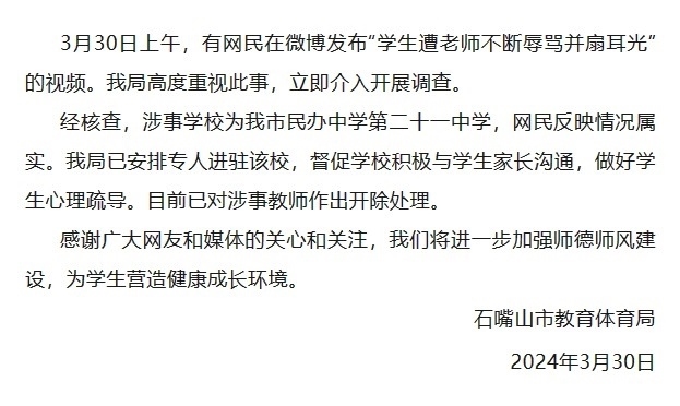 3月30日上午,有網(wǎng)民在微博發(fā)布“學(xué)生遭老師不斷辱罵并扇耳光”的視頻。石嘴山市教育體育局高度重視此事,立即介入開展調(diào)查。