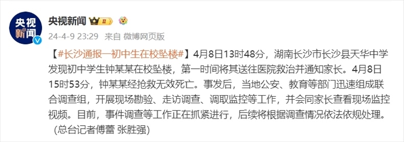 ·湖南長沙縣通報初中生在校墜亡:將根據(jù)調查情況依法依規(guī)處理。
