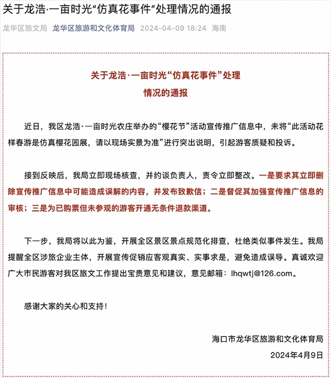 ·??谝晦r莊辦“櫻花節(jié)”樹上全是假花?官方通報:約談責任人,責令立即整改。