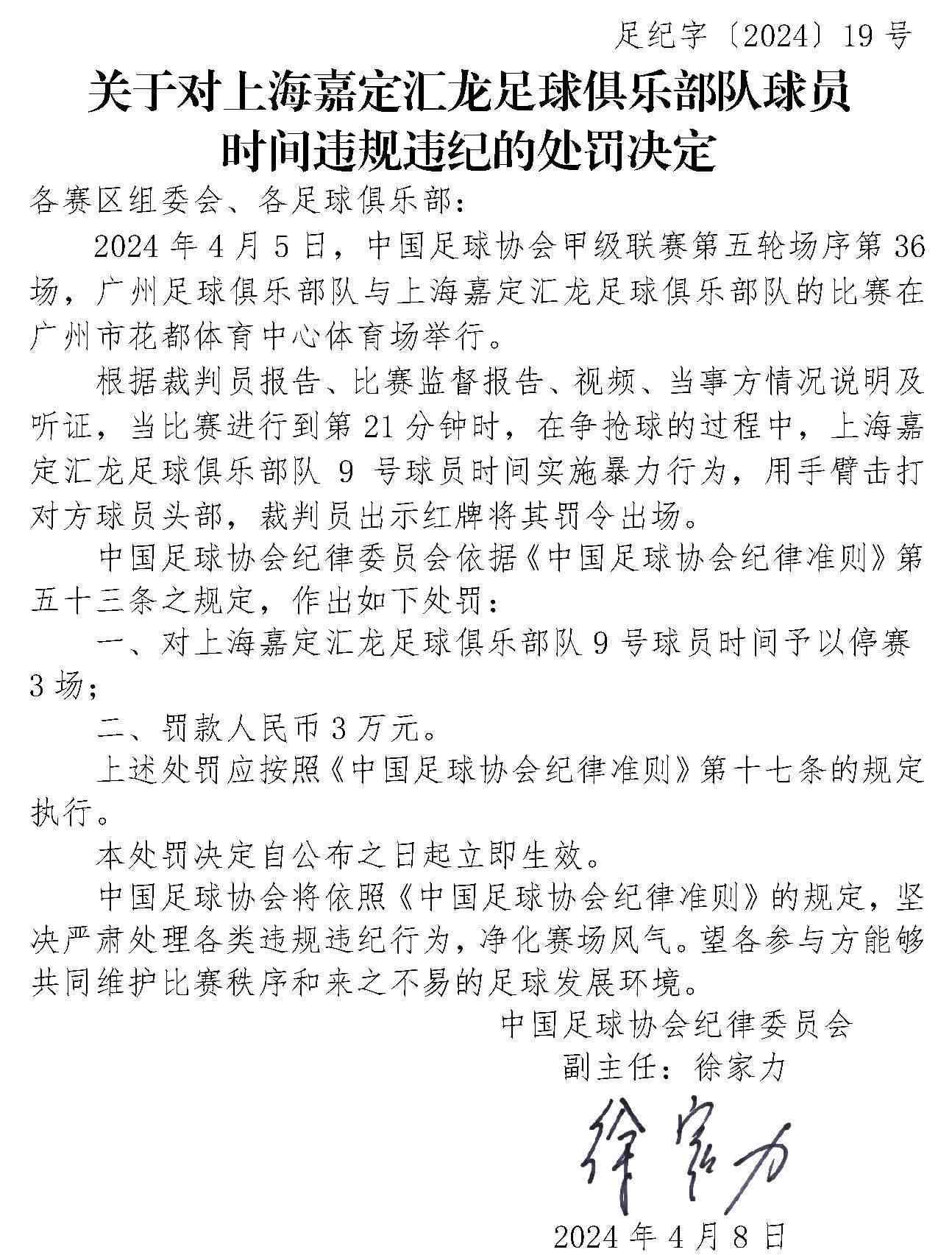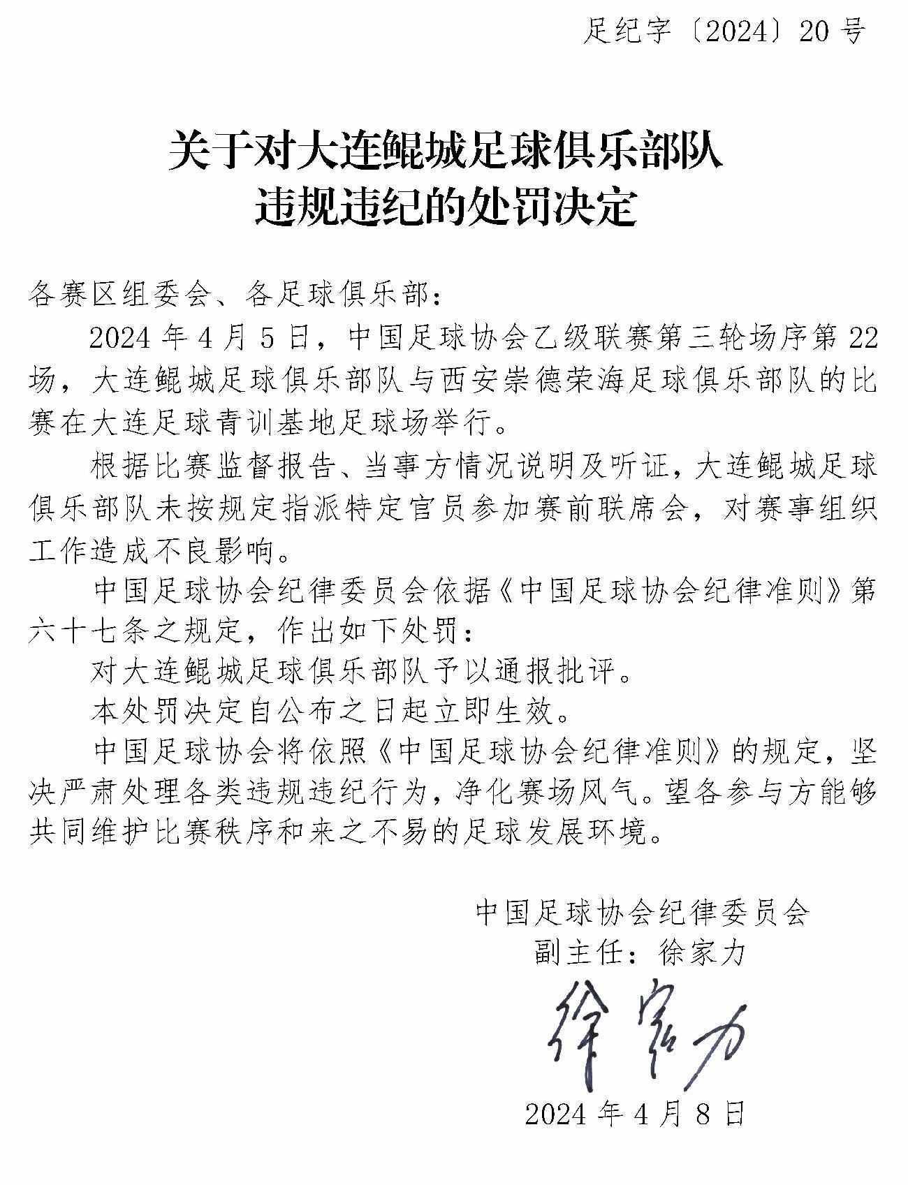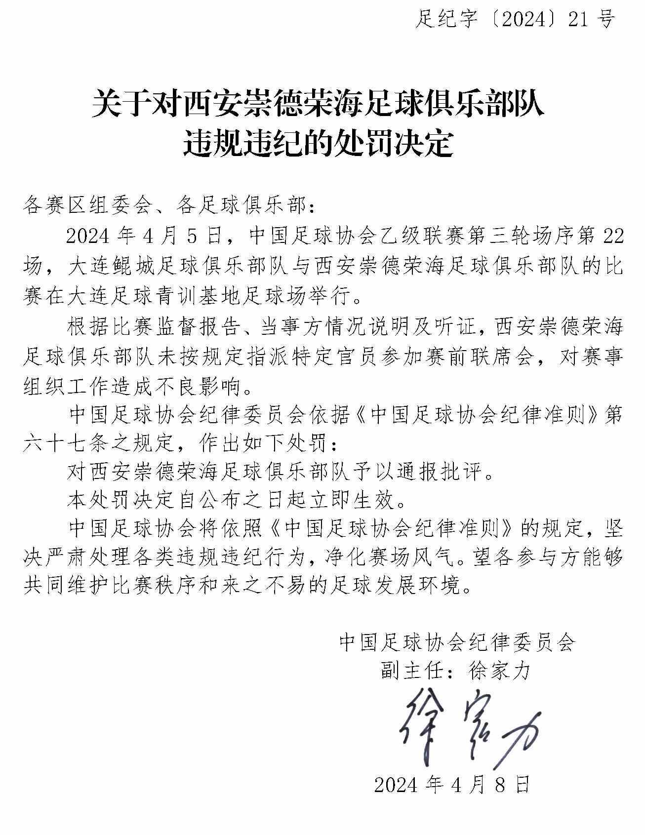 央視網(wǎng)消息:4月10日,中國足協(xié)網(wǎng)站發(fā)布《關(guān)于對上海嘉定匯龍足球俱樂部隊球員時間違規(guī)違紀(jì)的處罰決定》《關(guān)于對西安崇德榮海足球俱樂部隊違規(guī)違紀(jì)的處罰決定》《關(guān)于對大連鯤城足球俱樂部隊違規(guī)違紀(jì)的處罰決定》三份處罰決定。中甲聯(lián)賽上海嘉定匯龍9號球員因暴力行為被停賽罰款。中乙聯(lián)賽大連鯤城與西安崇德榮海兩家俱樂部因未按規(guī)定指派特定官員參加賽前聯(lián)席會,被通報批評。