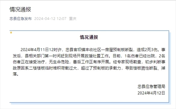 央視網(wǎng)消息:據(jù)“忠縣應(yīng)急發(fā)布”公眾號消息,重慶忠縣應(yīng)急管理局通報,2024年4月11日12時許,忠縣官壩鎮(zhèn)豐收社區(qū)一房屋預(yù)制板斷裂,造成2死3傷。事發(fā)后,縣相關(guān)部門第一時間趕到現(xiàn)場開展救援處置工作。目前,1名傷者已經(jīng)出院,2名傷者正在接受治療,無生命危險,善后工作正有序開展。經(jīng)專家現(xiàn)場勘查,初步判斷事故原因系二樓樓板臨時堆積荷載過大,超過了預(yù)制板的承載力,導(dǎo)致樓板脆性斷裂、掉落。