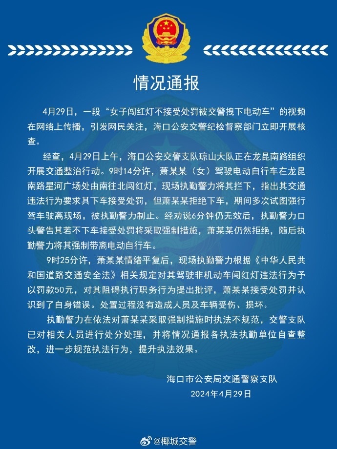 經查,4月29日上午,??诠步痪ш牠偵酱箨犝邶埨ツ下方M織開展交通整治行動。9時14分許,蕭某某(女)駕駛電動自行車在龍昆南路星河廣場處由南往北闖紅燈,現場執(zhí)勤警力將其攔下,指出其交通違法行為要求其下車接受處罰,但蕭某某拒絕下車,期間多次試圖強行駕車駛離現場,被執(zhí)勤警力制止。經勸說6分鐘仍無效后,執(zhí)勤警力口頭警告其若不下車接受處罰將采取強制措施,蕭某某仍然拒絕,隨后執(zhí)勤警力將其強制帶離電動自行車。