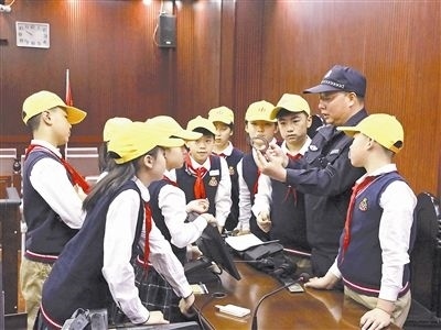 近日,河南省商丘市中級(jí)人民法院開設(shè)了一堂法治課,為十余名尋訪研學(xué)的學(xué)生實(shí)地講授法律知識(shí)。研學(xué)活動(dòng)中,在法治副校長(zhǎng)和法警的帶領(lǐng)下,同學(xué)們依次參觀了審判庭、羈押室、少年審判庭等場(chǎng)所,了解了法庭布置,體驗(yàn)了單警裝備,學(xué)到了法律知識(shí),“零距離”感受到了法律的崇高與神圣。圖為法警向同學(xué)們展示手銬。