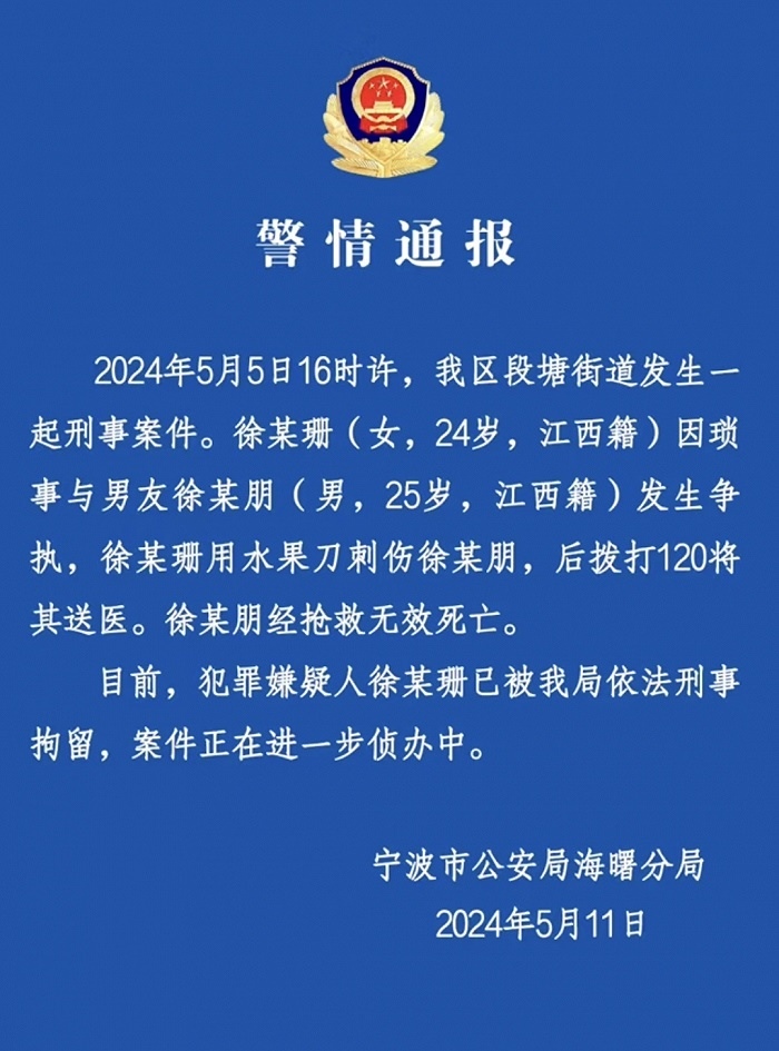 寧波警方通報女子因瑣事刺死男友:犯罪嫌疑人已被刑拘