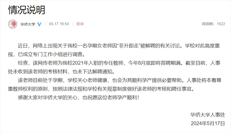 ·孕期女老師因“非升即走”被解聘?華僑大學(xué)回應(yīng):未下達(dá)解聘通知。