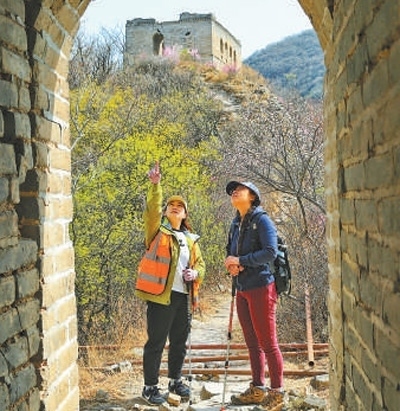 劉紅巖(左)在給游人講解長城保護相關知識。受訪者供圖
