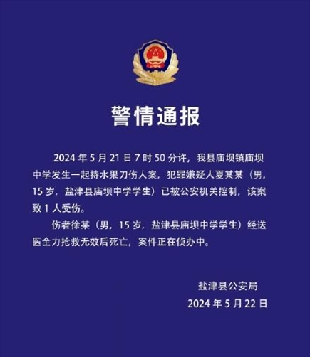 ·云南鹽津公安通報一中學發(fā)生持水果刀傷人案:嫌疑人已被控制,一人搶救無效死亡。