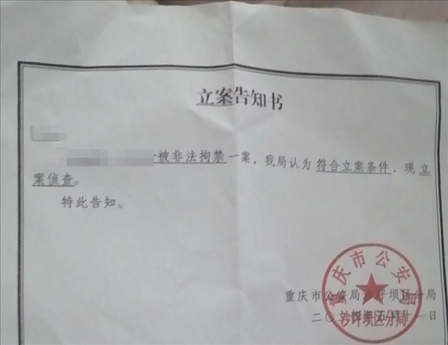 事發(fā)后,家屬向當?shù)嘏沙鏊鶊蟀?。王先生出示的立案告知書顯示,5月11日,重慶市公安局沙坪壩區(qū)分局對前文中的夫妻倆被非法拘禁一案立案偵查。