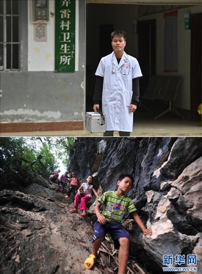 下圖為2012年9月5日,10歲的蒙富松(右一)爬懸崖去學(xué)校讀書(shū)。新華社記者 黃孝邦 攝