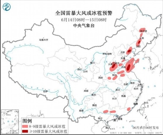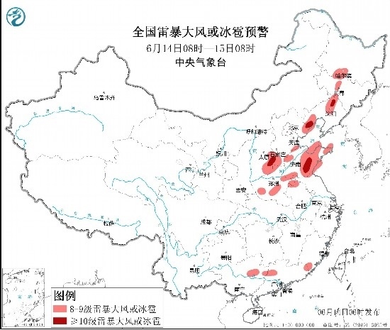 預(yù)計6月14日08時至15日08時,黑龍江南部、吉林中西部、遼寧西部和北部、山西東南部、河北南部和東北部、山東中東部和南部、河南中北部和東部、安徽北部、江蘇北部等地的部分地區(qū)將有8級以上雷暴大風或冰雹天氣,其中,遼寧北部和西部、山西東南部、河北南部和東北部、山東中南部等地的局地將有10級以上雷暴大風,最大風力可達11級以上;渤海部分海域、萊州灣、山東半島附近海域?qū)⒂?~10級的雷暴大風。黑龍江南部和中東部、吉林南部和西北部、遼寧中東部和西南部、河北東北部、山東中東部和南部等地的部分地區(qū)將有小時雨量大于20毫米的短時強降水天氣,其中,黑龍江中部、山東中南部等地的局地小時雨量大于50毫米,最大可達80毫米以上。預(yù)計,強對流的主要影響時段為今天午后至夜間。中央氣象臺6月14日06時發(fā)布強對流天氣藍色預(yù)警(見圖2)。