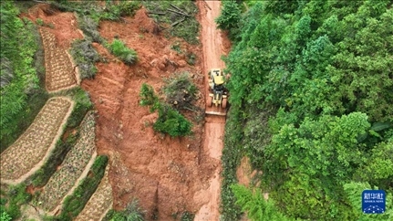 6月18日,工作人員駕駛機械在貴州省黔東南苗族侗族自治州錦屏縣鐘靈鄉(xiāng)清理進村道路(無人機照片)。
