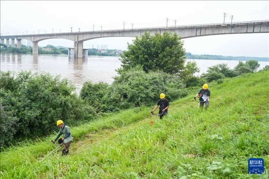 6月18日,長沙市天心區(qū)湘江堤岸,南托垸水利管理站工作人員在進行砍青除雜工作,確保河水清暢。