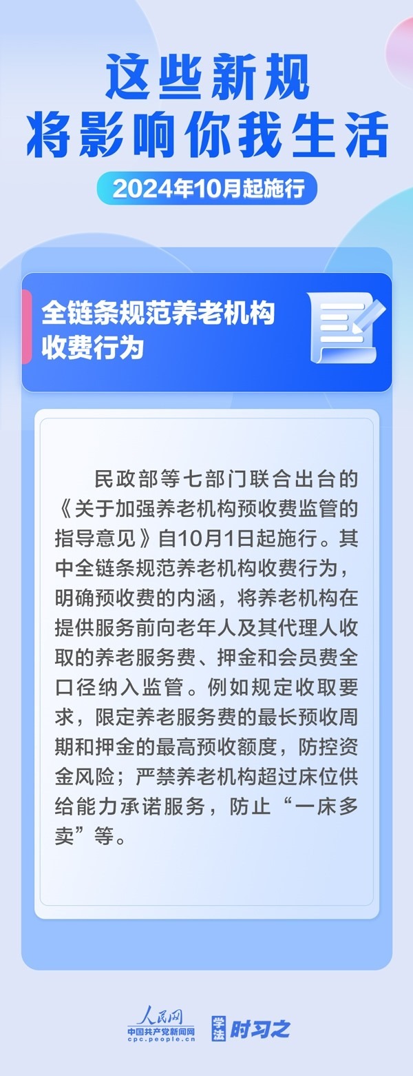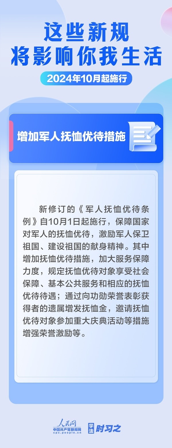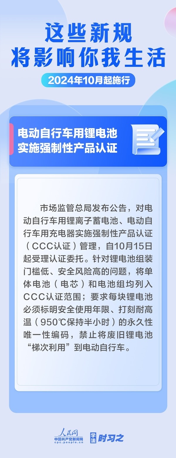 增加軍人撫恤優(yōu)待措施;全鏈條規(guī)范養(yǎng)老機構(gòu)收費行為;電動自行車用鋰電池實施強制性產(chǎn)品認(rèn)證……10月起,這些新規(guī)施行,將影響你我生活。